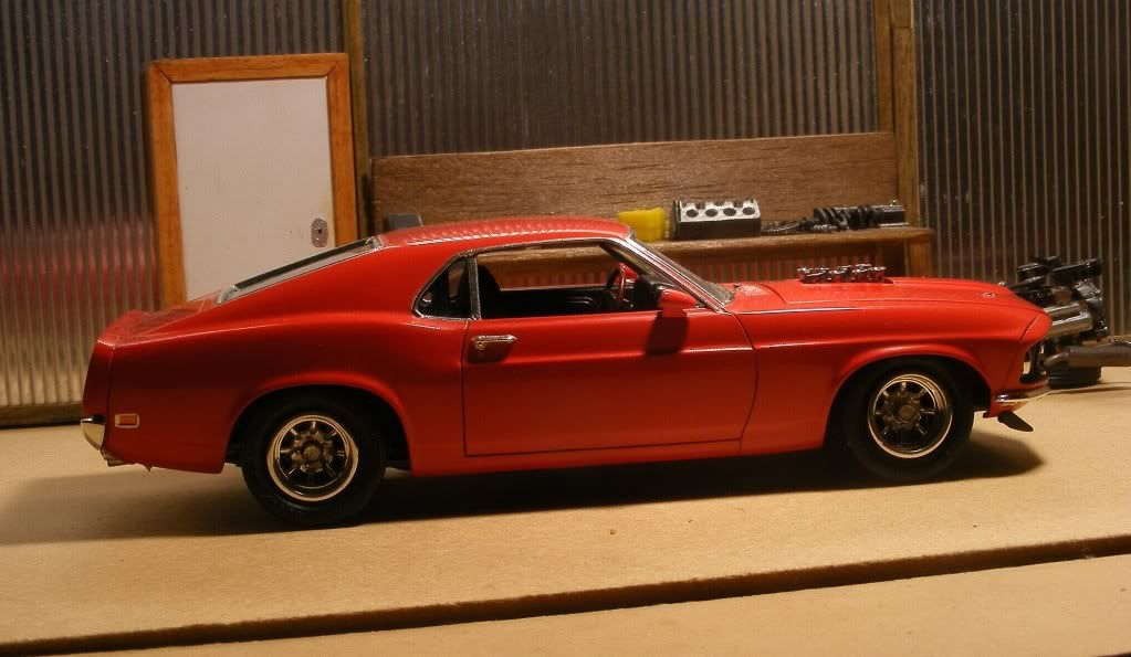 The background is a garage diorama which at the time the photos were taken was just started. More on that later. I've also included the '69 Mustang which is inspired by a car in a book called "Power Cars". by Craig Cheetam. The injector tubes are home made thanks to Tim James. The wheels are Minilites from an unkown kit as are the tyres and it's been lowered, with a bit of work under the bonnet/hood on both cars. Cheers bodgie43